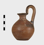 | Description: | Intact. Flat bottom; no base; handle high-swung, oval in section. Thick band glaze on rim; fine rings on neck. Shoulder: five sets of receding triangles between each set a dot rosette on a dotted stalk. Thin fine lines terminating in a broad band reaching to bottom. Pinkish-buff clay; brown-black glaze thinning to red-brown over most of pot. | |