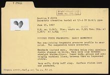 | Description: | Two non-joining fragments preserve profile to near point. Two suspension holes preserved. Handmade incised ware. Strokes below rim; careless double zigzags on belly, then wavy line between straight stroke-lines. Lower body, groups and converging vertical lines, between them an impressed circle. Very soft, dirty buff clay. Surface finish lost and powdered. | |