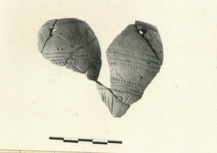 | Description: | Two non-joining fragments preserve profile to near point. Two suspension holes preserved. Handmade incised ware. Strokes below rim; careless double zigzags on belly, then wavy line between straight stroke-lines. Lower body, groups and converging vertical lines, between them an impressed circle. Very soft, dirty buff clay. Surface finish lost and powdered. | |
