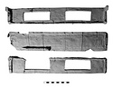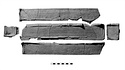 Description:   Mended, virtually complete. Numerous joining fragments. Chest with cut-out legs; lid has five model "granaries" side by side. Lugs on body, corresponding to ears on top. Intricate decoration in panels; some multiples.