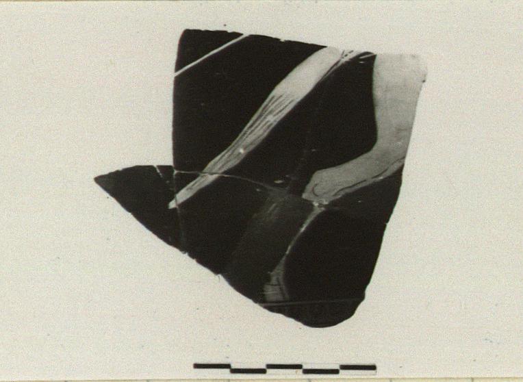 | Description: | Five joining fragments, strengthened by plaster. Hindquarters and tail of a horse, with a thin reserved line behind the tail, running parallel with it. Horse is standing on a band of egg border. Thin glaze inside; no relief contour. Shape III. | |