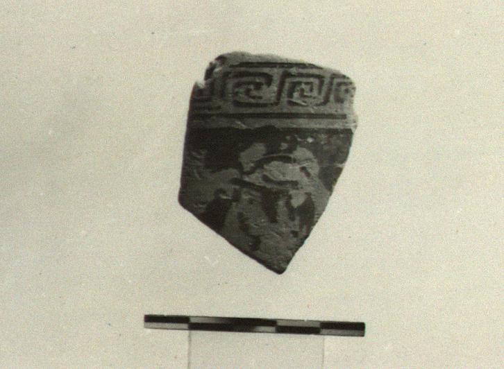 | Description: | Fragment from upper wall. Head of a youth, looking left, below a maeander border. He appears to wear a cap. No relief contour. Glaze fired red. | |