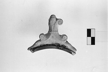Description:   Part of handle with adjoining wall preserved. Elaborately ornamented top of handle: pairs of spirals bound together. Glazed inside. Unglazed outside and handle, where appear abundant traces of fugitive white.