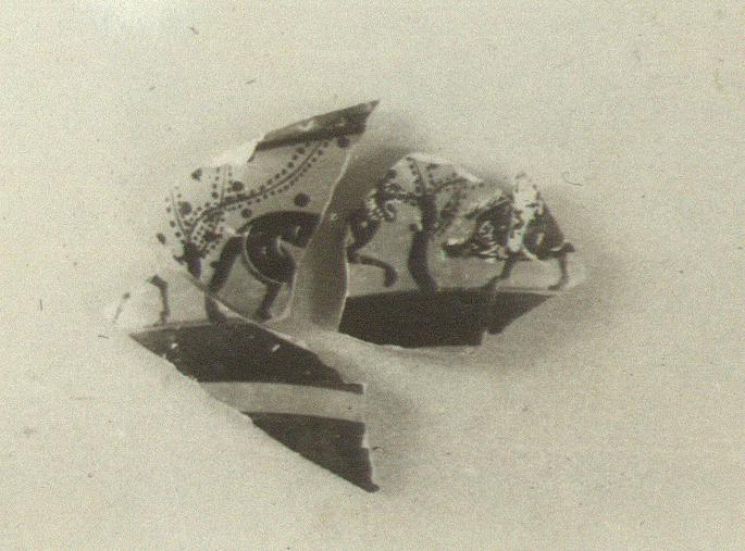 | Description: | Three fragments: a) Mended from two pieces. Foreparts of lion and boar; between them, the trunk of a branching vine. Red dots on both lion and boar. b) Lower edge of the profiled rim. Hindquarters of a lion; a vine behind him. c) Part of the reserved band below the figured zone and part of the hind legs of an animal left, and a single foot of another animal, right. Orange wash. Black glazed inside. | |