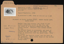| Description: | Mended from four pieces; the stubs of one handle preserved, a bit of the rim and the start of a reserved medallion at the center inside. Reserved band around inside of lip. Figured zone outside depicts women seated left, satyr right. One seated figure is preserved and part of another at the left edge of the piece. The satyr is preserved from the waist down. Vine in field. White for the woman's flesh and for dots on the garments. Three brown lines at the bottom of the figured zone. Orange wash. | |