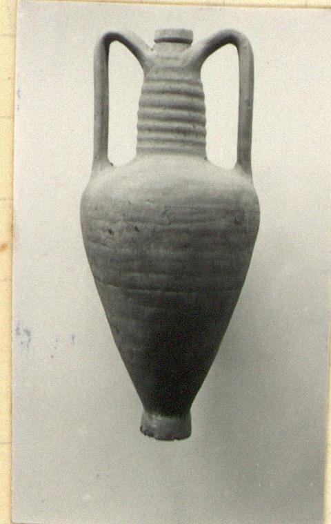 | Description: | Complete but cracked. Body narrows rapidly to tubular foot; neck tapers up to small mouth; ridged handles rise slightly over the mouth. Orange clay. | |