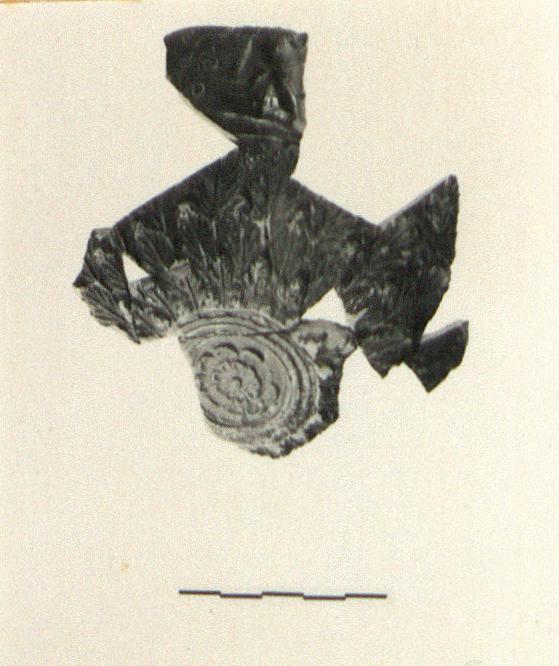 | Description: | Numerous fragments from base and wall, joining. Medallion and rosette, then four rows of overlapping leaves, the upper preserved part showing a suppliant at an altar. Glaze reddish to black. | |
