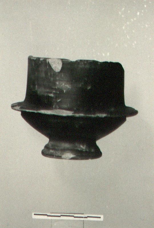 | Description: | One side missing except foot. Plain rim; upper walls slope inward slightly. Projecting flange at middle of body. Black glaze generally misfired to red. Cf. P 16150. | |