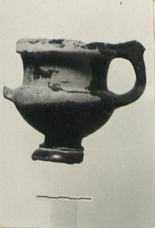| Description: | One handle and part of foot missing. Badly chipped. Broad conical foot in two degrees, marked by scraped groove. Rounded lower wall, concave upper body, bulging rim, spurred handles. Pink clay; black glaze dull and much worn. Cf. Agora XII, no. 703. | |