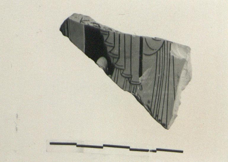 | Description: | Red figure fragment of open vessel. Outer side has draperies probably of standing figures. Inscribed on inner side. | |