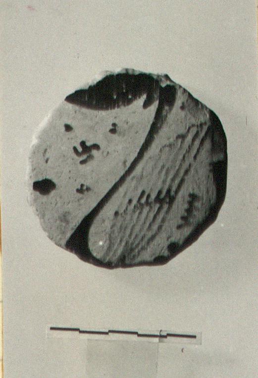 | Description: | Disc, probably jar-stop, cut from large circular painted vessel. At one point on the circumference is part of the rim of the original pot, with some of the black painted border preserved. The preserved black glazed decoration includes part of the hindquarters, body, neck and wings of a mythical beast, rendered in a stylized manner. On reserved background are zigzag, dots and swastika decorations in black glaze. | |