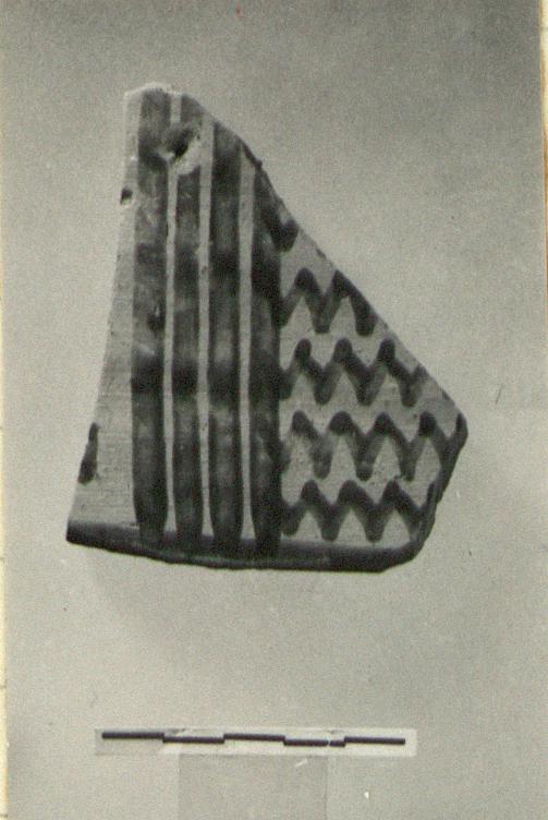 | Description: | Broken all around. Panels of horizontal zigzags separated by four vertical lines. Red painted decoration. Buff clay. | |