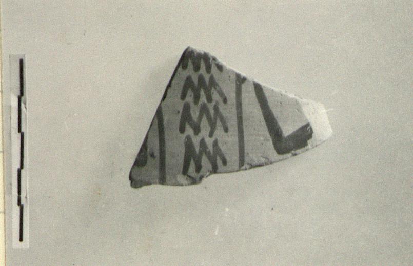 | Description: | From wall. Undistinguished forms separated by panels of horizontal zigzags between two vertical lines. Red painted designs. Buff clay. | |