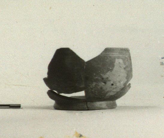 | Description: | Profile preserved, including whole of foot and about one-fourth of rim. Straight rim with shallow double grooves around outside. Illegible stamp in middle of floor. Samian A. | |