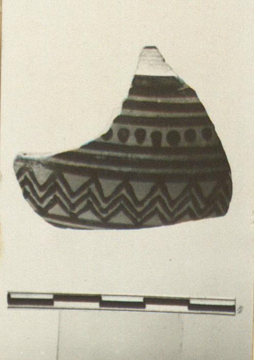 | Description: | Lip to mid-body of average size pyxis. Flange: horizontal face reserved, inner vertical face glazed. Body: row of dots, three narrow bands above and below; triple zigzags, then the start of another group of bands. Hard clay, darkened to dull buff from smoke. Middle Geometric. | |