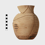 Description:   Handle, one-third of rim and chips from body missing. Mended from many fragments. Round mouth. Body banded. Wavy lines on neck. Panel on shoulder with stacked M ornament.