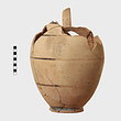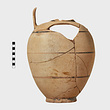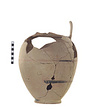 Description:   Mended from many fragments. All of rim, neck, part of shoulder, all of one handle and part of second missing. Oval body, high ring foot; four bands on body, glazed foot, crossed lines on band handles. Black glaze, largely gone.