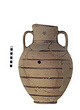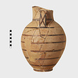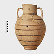 | Description: | Rim and fragments from wall missing. Partially restored in plaster. Mended from numerous fragments. Broad bands on body, glazed foot. Double bands at top and bottom of neck. Two 8-point stars on neck. Double crossed bands on strap handle. Small round hole in wall as if intentionally bored. Thin brown glaze, reasonably well preserved. | |