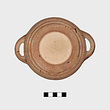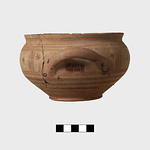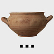 Description:   Mended from many fragments. Complete except for small rim and wall fragments now restored. Out-turned rim, slightly off-set disk foot. Seven sets of vertical lines inside rim. Banding on rim and upper wall region. Two panels set off by triple vertical lines, with two stars and triple zigzag patterns in each. Additional stars on either side of handles. Banded on lower body.
