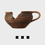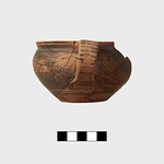 Description:   Half of rim and pieces of body missing. Mended from many fragments. Out-turned rim. Horizontal banding on handle. Reserved band on inside and outside of rim.