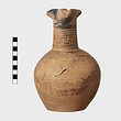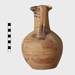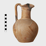 Description:   Trefoil oinochoe. Fragmentary. Parts of mouth handle, body and all of base missing. Restored in plaster. Mouth glazed, front of trefoil narrow reserved strip with bars. Neck: hatched battlement in front; dotted crossing diagonals in back. Top of shoulder: dog's teeth. Body striped. Glazed area below. Double reeded handle, laddered.
