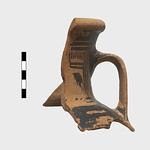 | Description: | Part of neck, shoulder and one handle. Lip: row of dots. Neck panel, front and back, rear half of horse; manger preserved in one. Otherwsise glazed, with beginning of groups of reserved bands at bottom of fragment. Handle, laddered; stroke star in reserve panel. Brown glaze, worn. Cf. Hesperia 68 (1999), p. 262, n. 10. | |