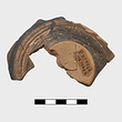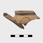 Description:   a) Rim into lower body with one handle. Two joining fragments. Inner face of rim has groups of strokes. Broad band on lip outside. Body glazed. Panel between handle: wavy line. Handle glazed.