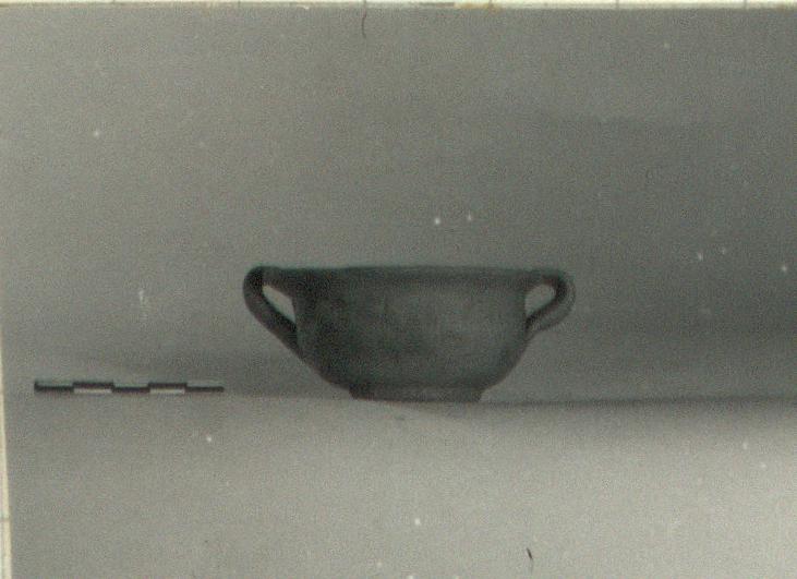 Description:   Intact except for chips from rim. Raised base foot, rounded body, flaring rim, plain lip. Two strap handles from rim to body.