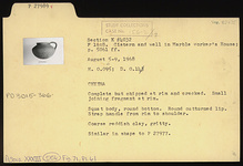 | Description: | Complete but chipped at rim and cracked. Small joining fragment at rim. Squat body, round bottom. Round out-turned lip. Strap handle from rim to shoulder. Similar in shape to P 27977. Coarse reddish clay, gritty. ADDENDA P 27977: Squat body, round bottom, round out-turned lip. Strap handle from rim to shoulder. | |