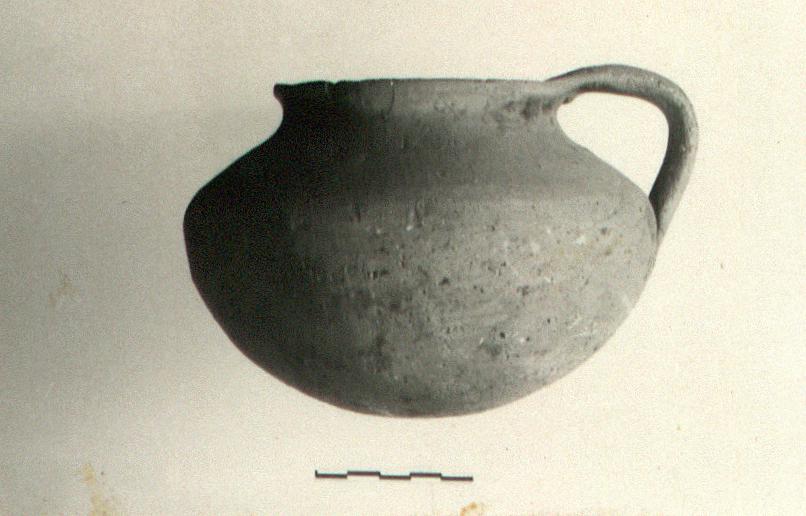 | Description: | Complete but chipped at rim and cracked. Small joining fragment at rim. Squat body, round bottom. Round out-turned lip. Strap handle from rim to shoulder. Similar in shape to P 27977. Coarse reddish clay, gritty. ADDENDA P 27977: Squat body, round bottom, round out-turned lip. Strap handle from rim to shoulder. | |
