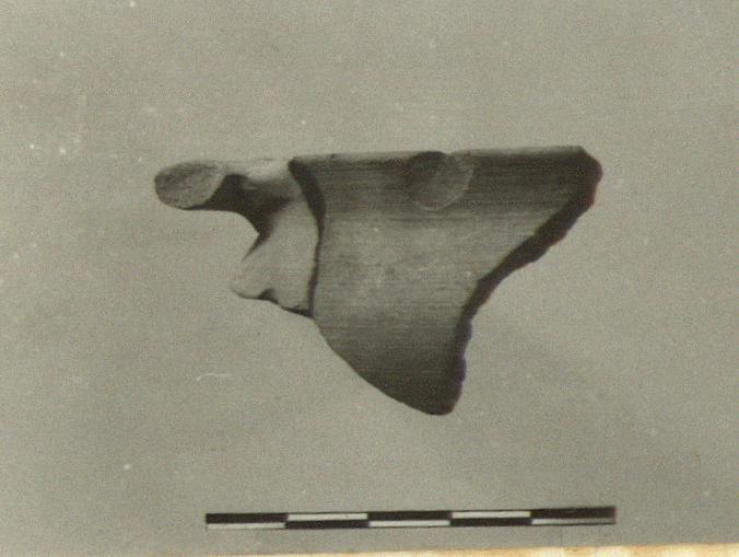 | Description: | Two fragments mend to part of rim, shoulder and upper end of one handle. Lip not offset; it rises in a gentle reverse curve from the shoulder and tapers to a fine rim. Thin hard pinkish-buff clay. Unglazed. One fragment darkened, probably from smoke. Cf. P 3682, P 3741, P 3742 from well H 15:1. Middle Geometric. | |