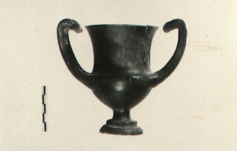 | Description: | Mended from seven fragments; complete except for part of one handle, restored. Plain lip, long concave upper body, shorter convex lower body, loop handles, tall stem, moulded foot. Dull glaze, black to reddish brown. Cf. P 27972. | |