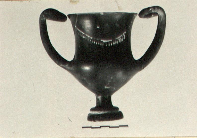 | Description: | Mended from four joining fragments. Missing are parts of handles and rim fragment. Restored in plaster. Similar in shape to P 27972. Decoration on upper wall: garland with hanging pendents on one side, hanging ribbons on other in thinned clay. Inscribed in thinned clay above pendents: Α Φ Ρ Ο Δ Above ribbons: Ι Τ Η Dull black glaze, peeling. ADDENDA P 27972: Carefuly modelled foot, tall stem, deep bowl. Gently concave upper wall; high swung loop handles. | |