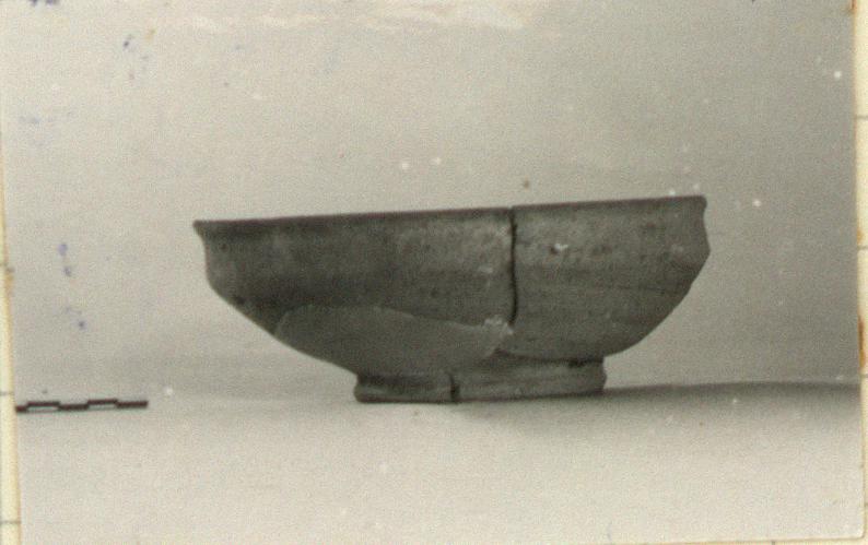 | Description: | Four joining fragments partially held together by plaster give base and about one-third of rim. Low base ring. Lower wall flares out, upper wall angular. Out-turned rim. Shallow bowl. Gritty, reddish clay, unglazed. | |