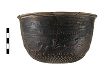 Description:   Mended from numerous pieces. Wall fragments and about one-fifth of rim missing. Restored in plaster. Central medallion: Gorgon head surrounded by pointed leaves, with darts between tips of leaves. Lower wall, six rows of small veined leaves surmounted by alternating birds and masks. Frieze, hunting scene. Figure with sling facing right; a bird; a dog charging right; another dog felling a stag turned to look back over its shoulder, a bird above it; a second figure, winged, with sling, facing right; a charging dog with bird above it; a leopard or panther (spotted) charging right and looking back over its shoulder; two more birds; a lion charging right; a bird; a figure on horseback advancing left. Above, a band divided by four panels, each with a bird flying left. The band itself is alternating crosshatches and chevrons. Above: spirals surmounted by anthemia. Reserved line for miltos, now missing. Beautifully executed with remarkable detail.