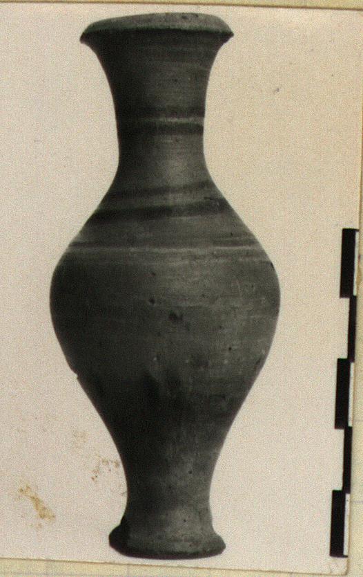 | Description: | Fusiform shape. Complete except for chips from the foot. Several rings of purplish-brown. Slightly porous dark buff clay. | |