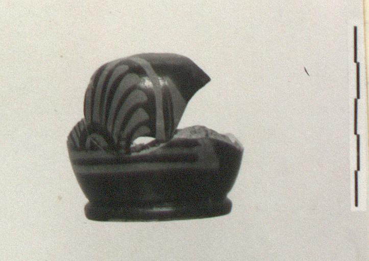 | Description: | Squat body. Two joining fragments preserve base, front wall and shoulder. Low ring foot offset on underside. Low rounded body and sloping shoulder. Decoration consists of single stylized palmette with eleven narrow petals rounded at ends. Palmette bordered by narrow reserved band pierced by central petal; stylized lotus petals on either side. Pinkish clay; good black glaze. | |