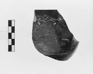 | Description: | Two joining pieces preserve section from lip to lower wall including lower attachment of handle. Strap handle. Below lip, ivy in incision and applied yellow. Below handle attachment a groove wheel run beneath the glaze. For shape, cf. P 27970. Fully glazed. Glaze mottled and dull. ADDENDA P 27970: Bowl-shaped. Open mouth, strap handles spurred with plastic ivy leaves. Tall, moulded base ring. Hellenistic baggy kantharos: Boiotian? | |