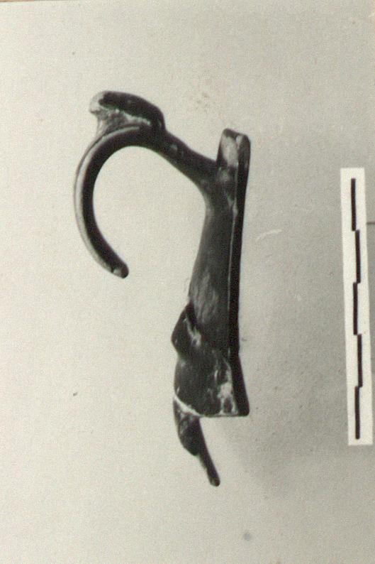 | Description: | Two joining fragments. Section from lip to lower wall including upper part of handle and lower attachment. Strap handle, blurred applique mask thumb rest. Below handle a groove. Fully glazed. Wheel run groove through glaze. Glaze partly fugitive. | |