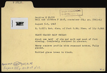| Description: | About one-half of rim and wall and most of foot missing. Completely restored in plaster. Heavy concave profile with recessed bottom. Fully glazed. Mottled glaze brown to black. | |
