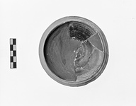 | Description: | About one-half preserved in four joining fragments. Part of center of floor, of wall and of rim missing and restored in plaster. Ring foot. No articulation on exterior wall. Rilled rim bevelled above, slope outward, profile in two steps. Exterior and top of rim unglazed. Floor glazed. Dull black glaze. | |