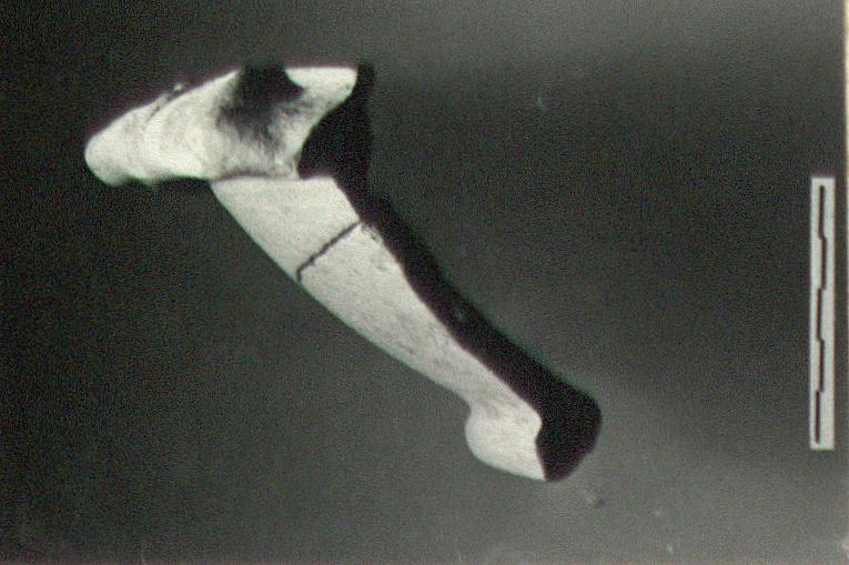| Description: | Profile preserved from lip to foot in two joining fragments. Ring(?) foot. Overhanging rim, convex in profile; plain moulding at top around inner edge. Handle grip complete: two plastic eggs and three darts. Pink-buff clay, ca. 7.5YR 8/2. | |
