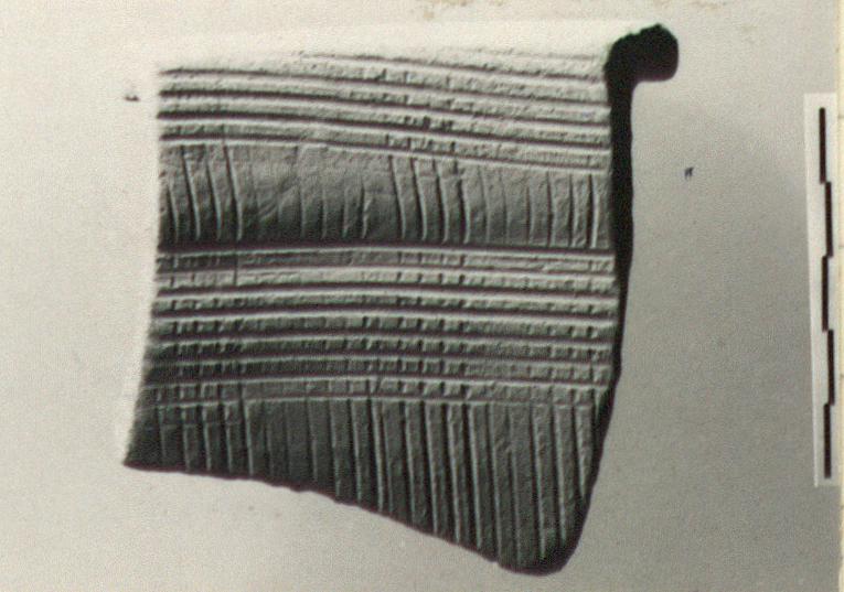 | Description: | Fragment from rim and wall. Overhanging rim, flat on top; a plain moulding 0.02m. below it on exterior. On all interior surfaces to top of rim, vertical and horizontal scored lines. Pink-buff clay. Coarseware; "Umbrella Stand". | |