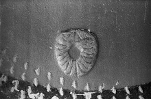 | Description: | Two joining fragments. Ca. two-thirds of foot and floor and small section of wall and lip preserved. Everted rim. Three stamped palmettes within rouletting on floor. Brown stacking circle on floor. Underside brown from stacking. Fully glazed. Glaze brown to black. | |