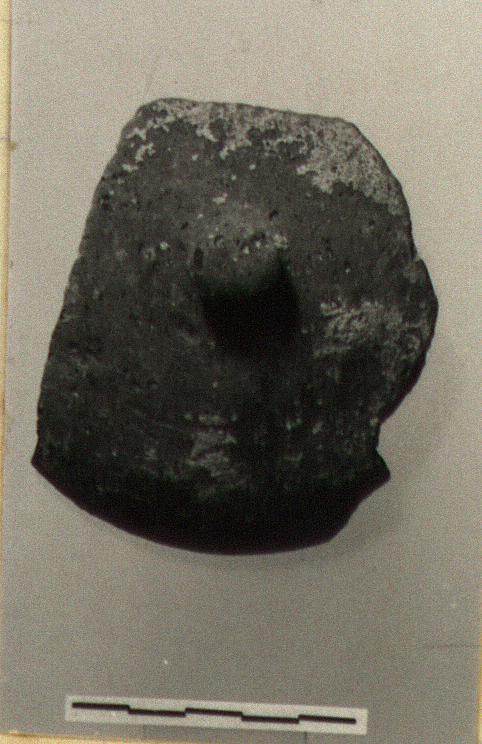 | Description: | Full profile, and about one-fourth of circumference preserved. Mushroom knob. Wall of convex profile. Brown pitted clay. | |
