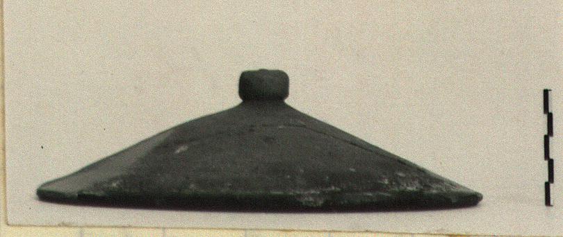 | Description: | Four joining fragments. Fragments missing of outer part and edge. Restored in plaster. Conical profile. Globular knob. Truncated above. Brown clay. | |
