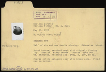 | Description: | Half of rim and one handle missing, otherwise intact. Round bottom; vertical neck with slightly flaring lip; vertical strap handle. Coarse gritty ash-gray clay with brown core. Fired red on bottom. Cf. Hesperia 3 (1934), p. 390, no. D 71. | |
