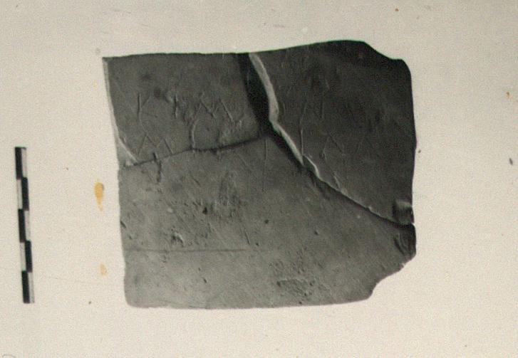 | Description: | Mended from three fragments. Rectangular fragment of wall of amphora with incision: ΚΙΜΟΝ / ΜΙΛΤΙΑΔΟΥ Hard red-brown clay. | |