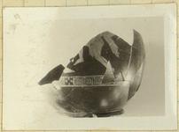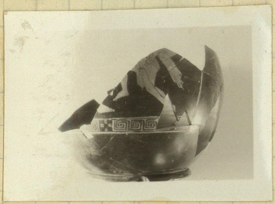 | Description: | Base and lower part of body preserved, mended from many pieces. Lower border, maeander and checkerboard pattern; right side, single reserved line. Parts of two figures preserved in this panel: at the right, the lower part of a nude male figure running left; the body missing from the waist up, also his right knee and most of his left foot and ankle. Over his left arm (and probaby over his shoulder, since the other end of it appears between his legs) he carries a chlamys. To the left is the bare right foot of another figure. It is raised above the ground line formed by the maeander pattern. No contours; inner drawing in thin black relief lines. Pink clay; good black glaze; resting surface of ring base and the space within it, reserved. On the interior a thin black wash. Traces of pink wash on the figures. | |