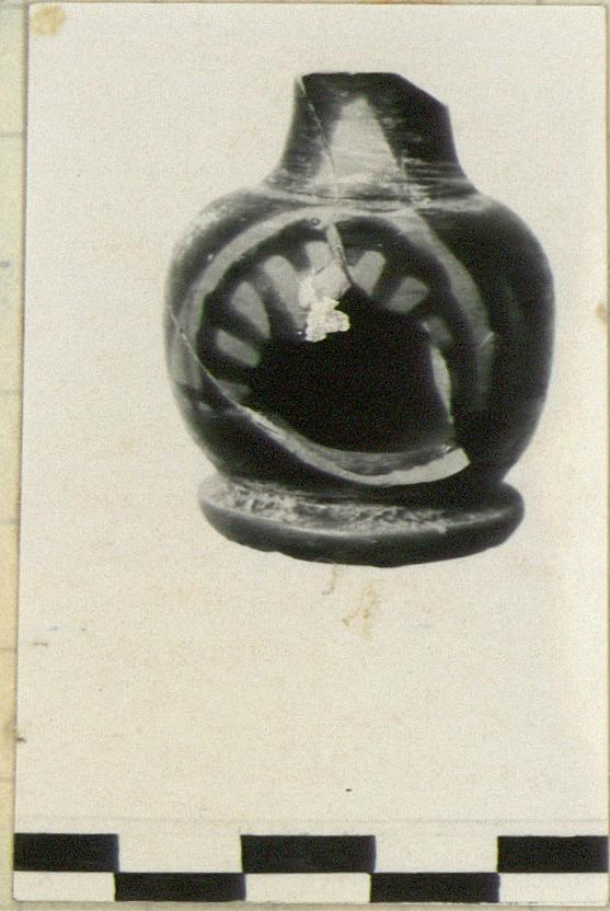 | Description: | Squat body. Mended from three pieces. Neck and part of body missing. Ring foot, plump body. Reserved: resting surface and bottom, triangular area on body on which palmette is painted. Orange clay. Unevenly applied black glaze. Cf. Hesperia Suppl. 25 (1992), p. 7, n. 24. | |